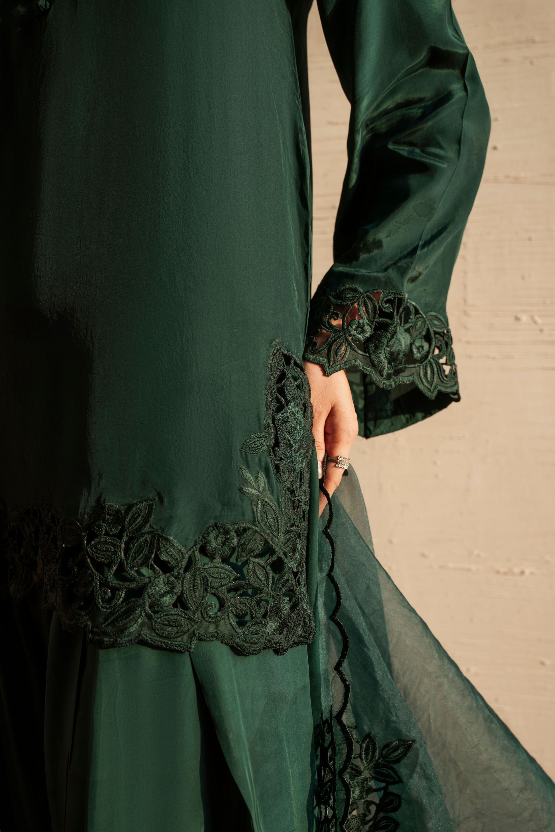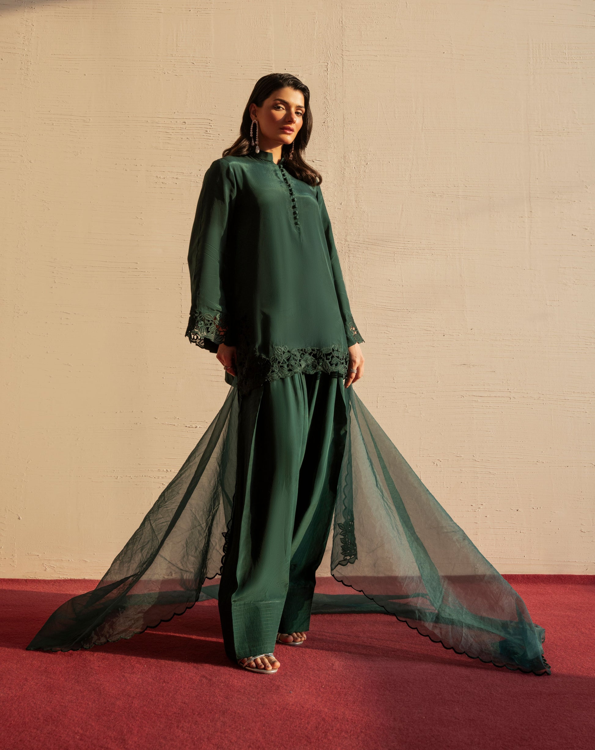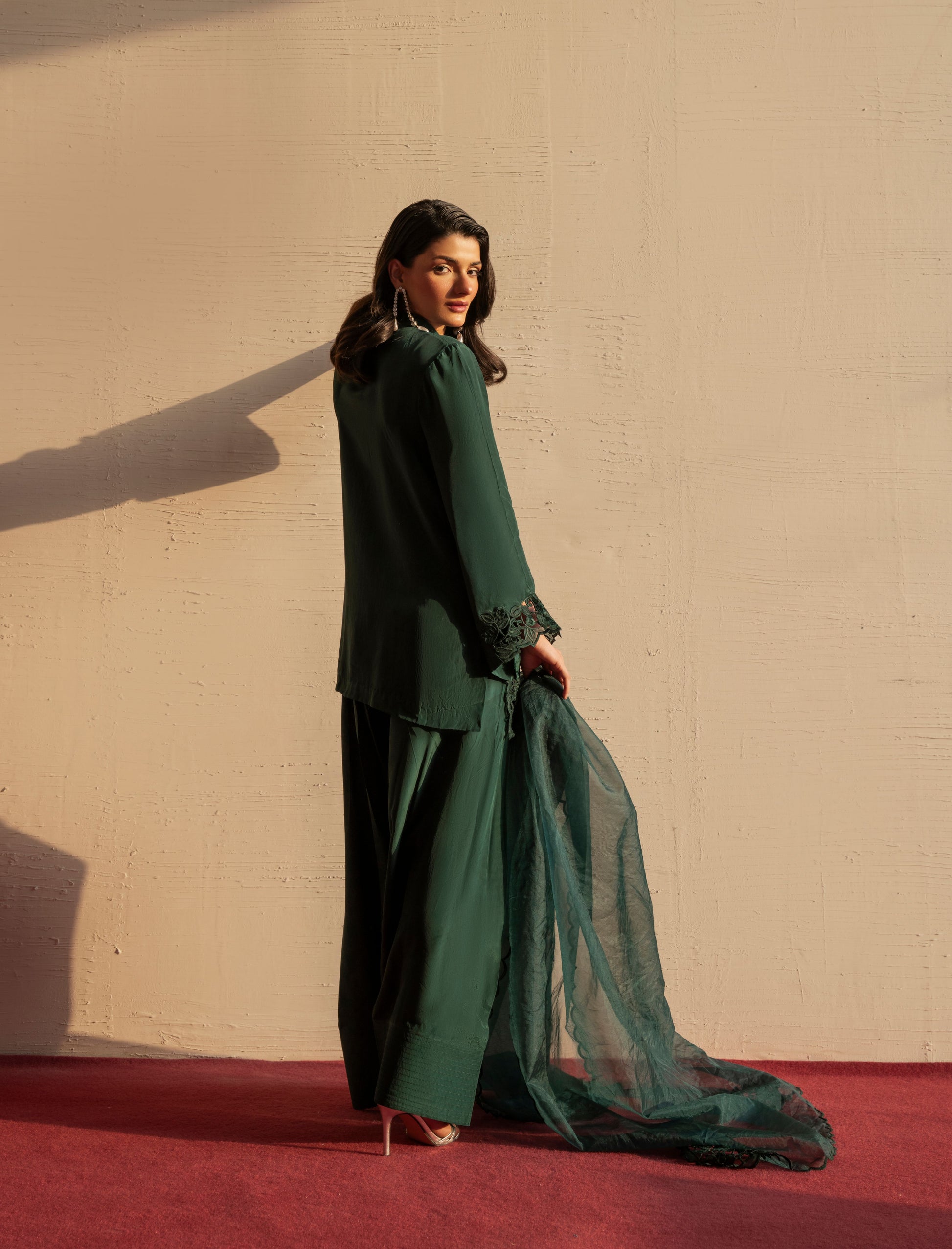 Elara embodies effortless elegance in a serene green hue. Designed with a fluid silhouette that drapes beautifully, it feels fresh, refined, and timeless. A piece that brings calm confidence and understated luxury to every look.